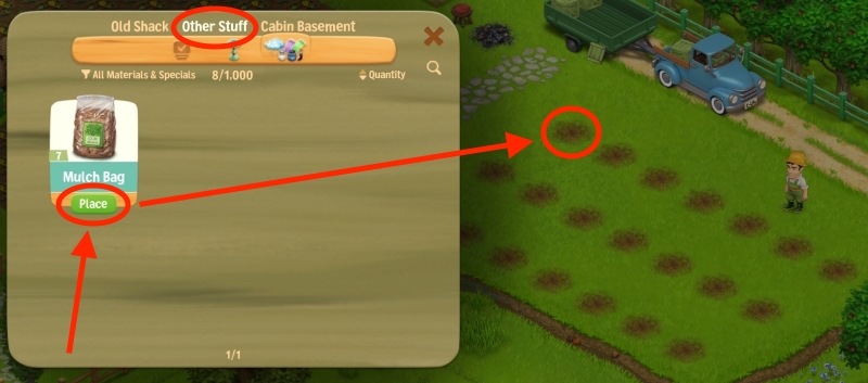 Tree Mulch can be placed in any of the two Orchards in Bellflower Meadow as a Mulch Tree Ring to help the Tree retain ground moisture, reducing the time fruits ripen by 15%!