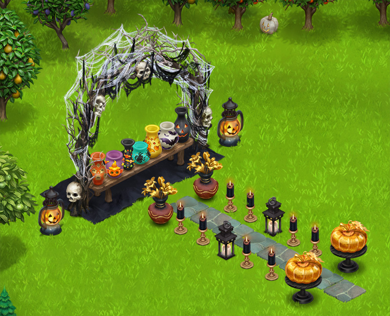 - The Haunted Path, consisting of The Arch of Shadows, and 6 types of Decorations, plus the Halloween Haunted Pots Collection itself. (Contest 1)